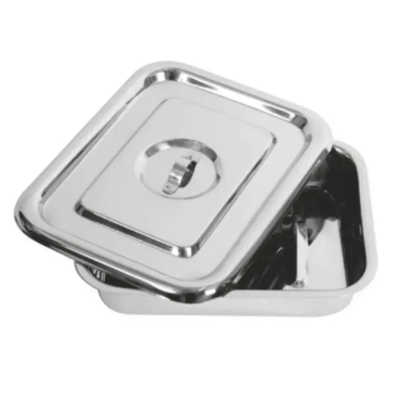 It features a lid, often flat with recessed handles, for easy handling and to maintain sterility and prevent contamination.