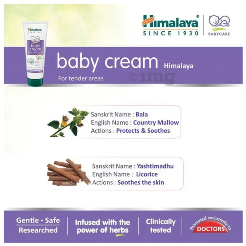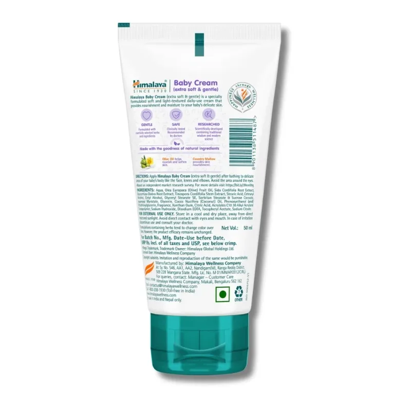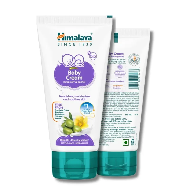 Himalaya Baby Cream 50ml is an important healthcare product used to keep the baby's skin moisturised and free from dryness. It is made with natural ingredients such as country mallow, licorice, and olive oil, which help in nourishing and softening the skin.