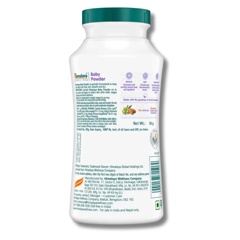 Mild and gentle: Himalaya Baby Powder is typically formulated to be mild and gentle on a baby's sensitive skin. It is often free from harsh chemicals, artificial fragrances, and preservatives that can potentially irritate the skin.