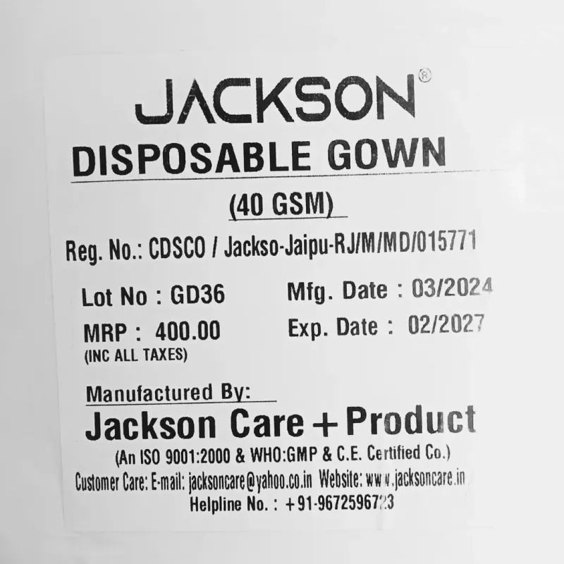 Jackson Disposable Gown (40 GSM) is a surgeon gown used to protect both the surgical team and the patient by preventing the transfer of infective agents during medical procedures.