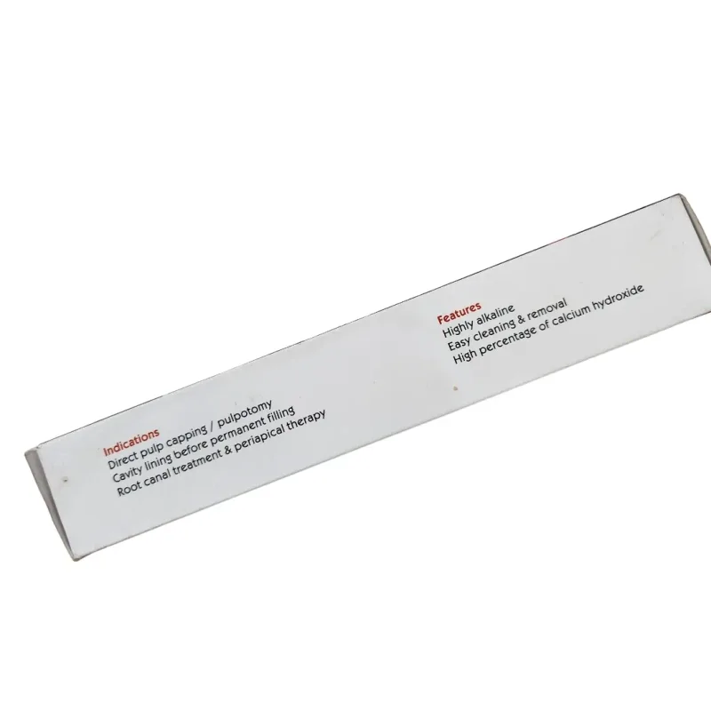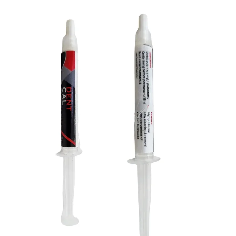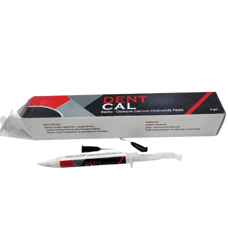 Dent Cal - Radio Opaque Calcium Hydroxide Paste is a ready-to-use dental material designed for root canal treatments and pulp capping. It contains a high percentage of calcium hydroxide, making it highly alkaline and effective in promoting the formation of secondary dentin.