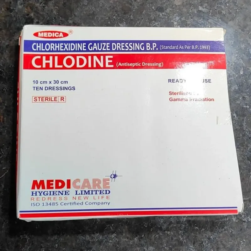 Medicare Chlodine Chlorhexidine Gauze Dressing B.P. is an antiseptic wound dressing used to protect and promote healing in burns, ulcers, minor wounds, and skin graft donor sites.