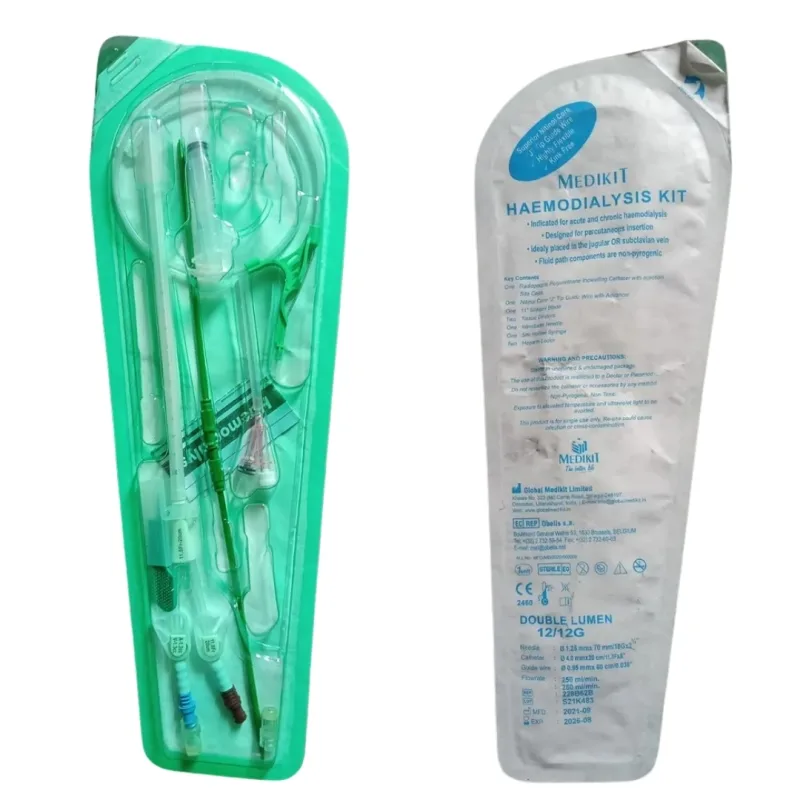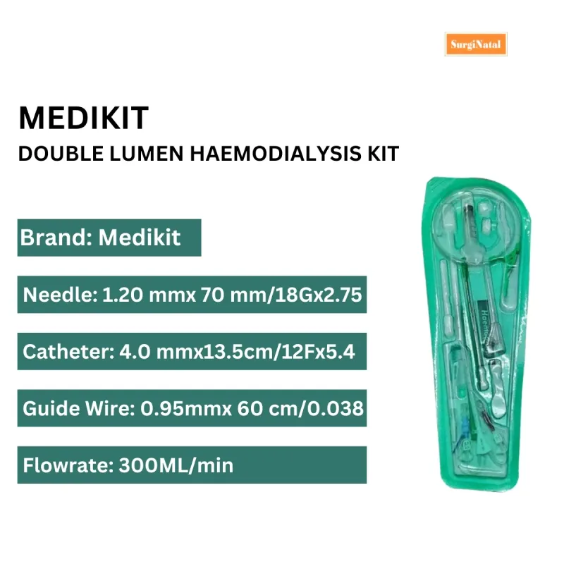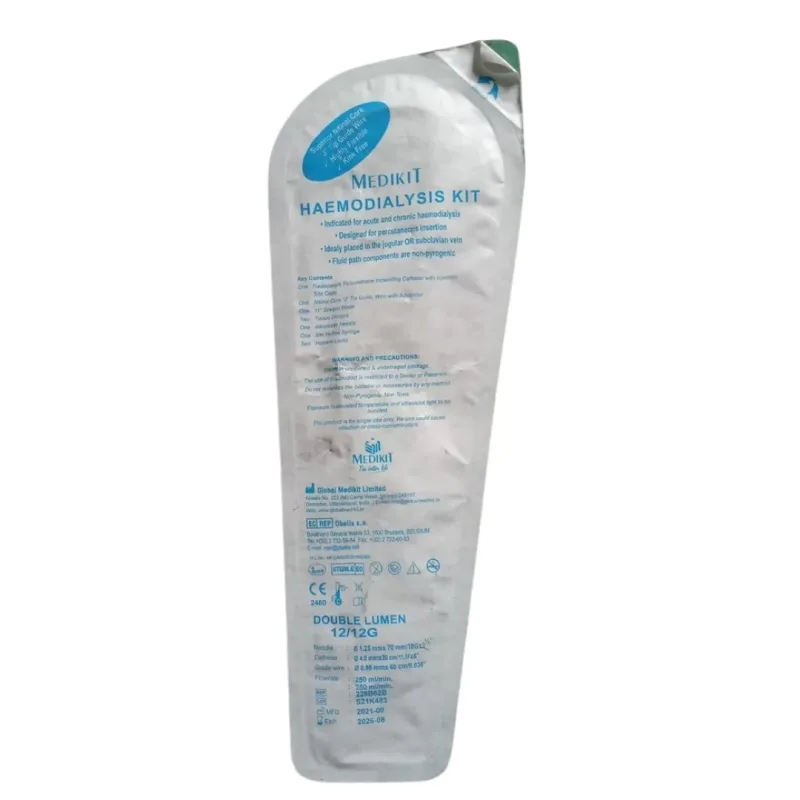 Medikit Double Lumen Haemodialysis Kit is a temporary vascular access device used for patients undergoing haemodialysis. It has a double lumen catheter that ensures efficient blood flow for both the removal and return of blood during dialysis treatment.