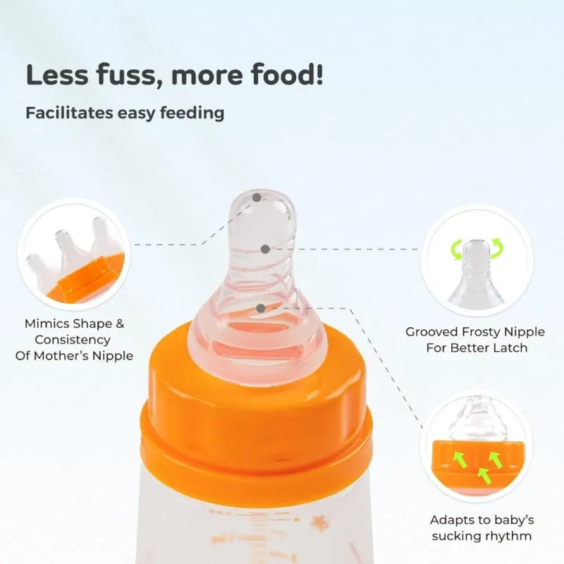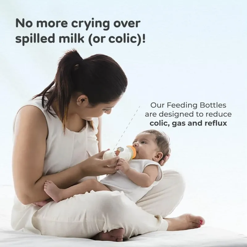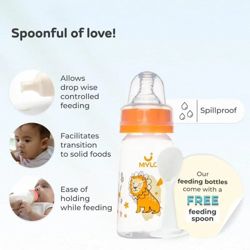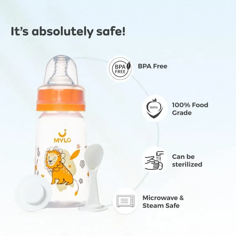 Mylo Feels Natural Feeding Bottle with Feeding Spoon is a 2 in 1 baby care product used to provide a comfortable and safe feeding experience for little ones. It is made from high-quality, BPA-free food-grade materials, ensuring absolute hygiene and safety. Its advanced anti-colic nipple features tiny air vents that prevent air from entering the toddler's tummy, reducing colic, gas, and discomfort.