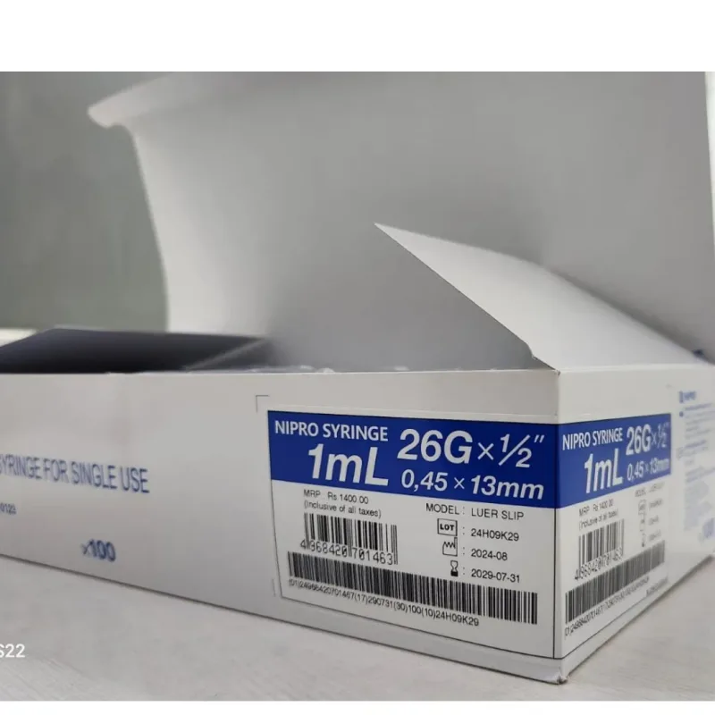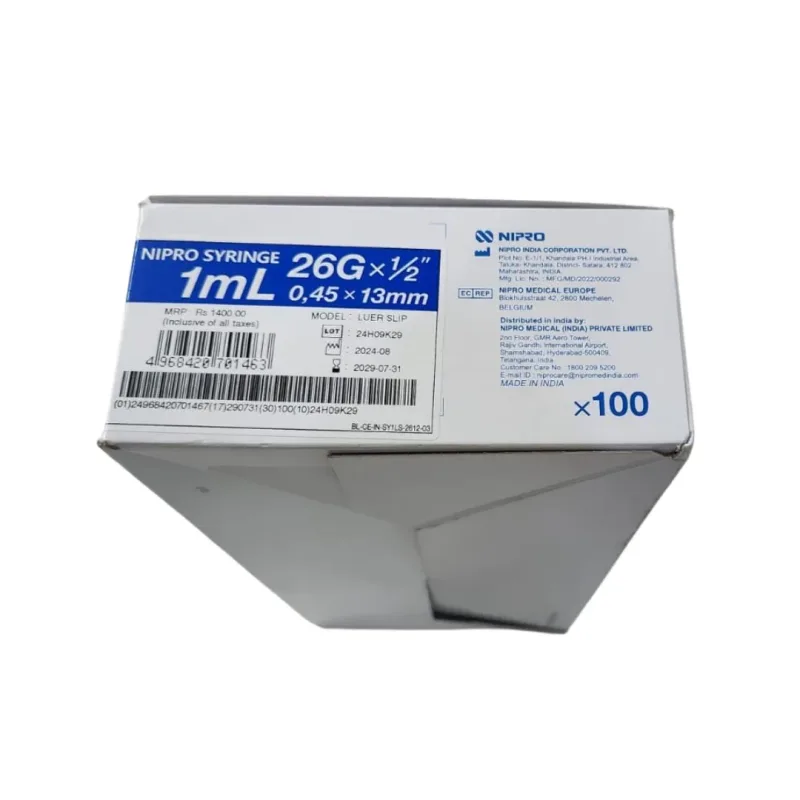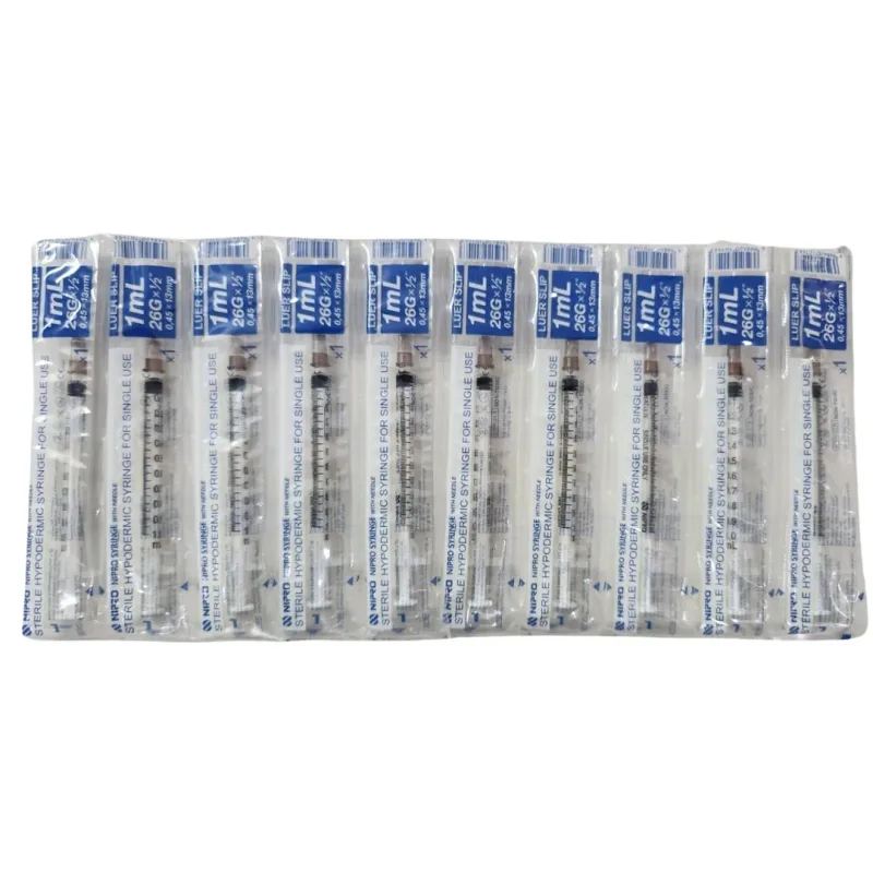 Nipro Hypodermic Syringe 1ml with 26G*0.5inch Needle - 100 Units Pack is a medical device used to deliver fluid medicine into the patient's body. It is made of medical grade material which means not made with latex, BPA, DEHP or PVC.