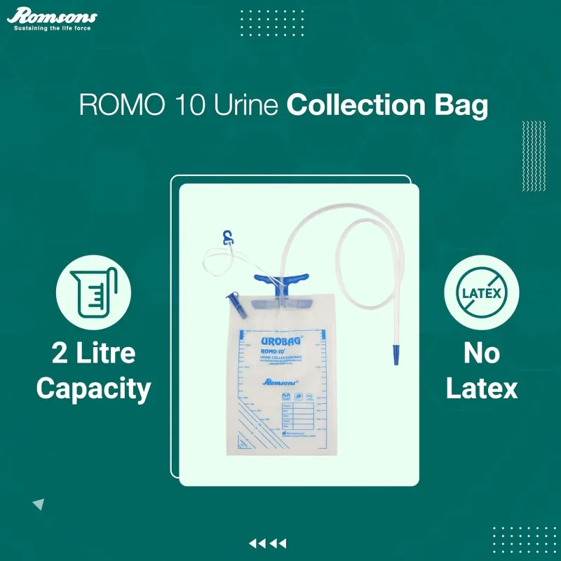Romsons Romo-10 Urine Bag is a drainage bag that collects urine of patients that have urinary incontinence (leakage), urinary retention (not being able to urinate), surgery that made a catheter necessary, or another health problem.