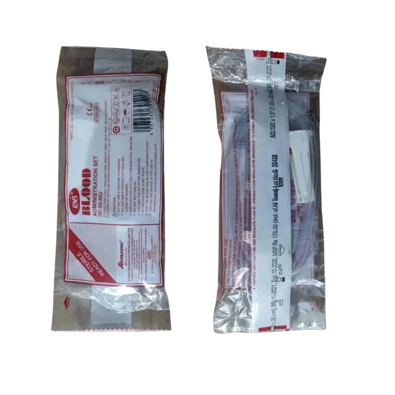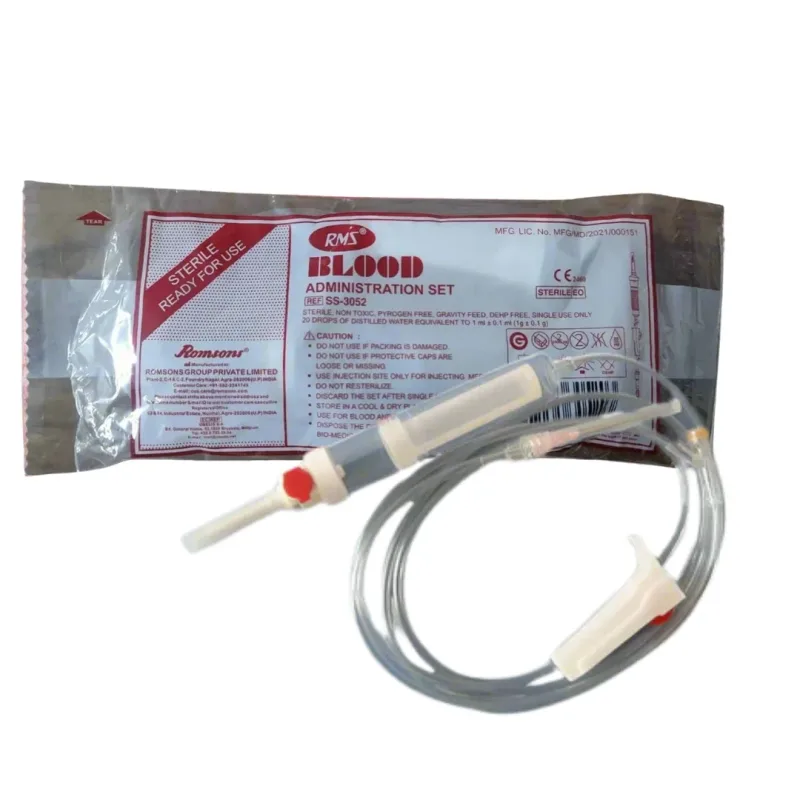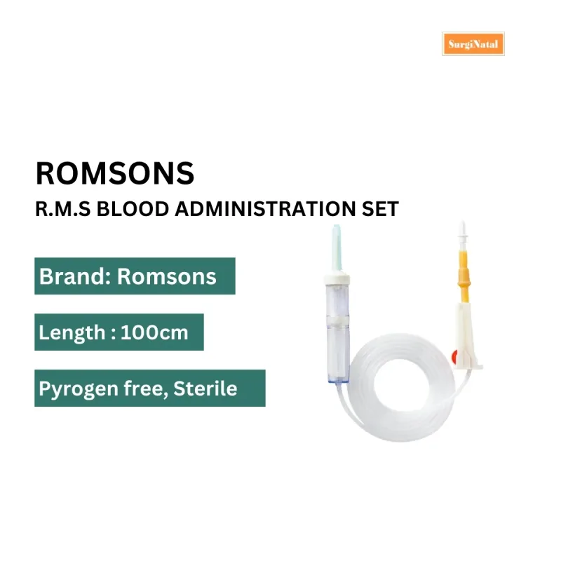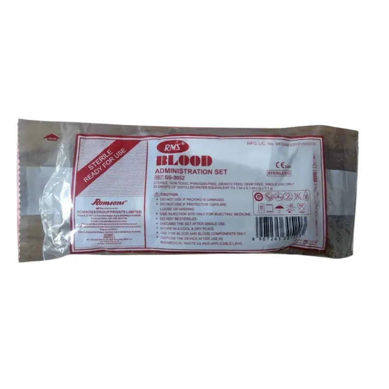 Romsons R.S.M Blood Administration Set also known as blood transfusion set is a medical device used to transfer blood from a container to a patient's veins. It is made of medical grade material which is non toxic and pyrogen free.