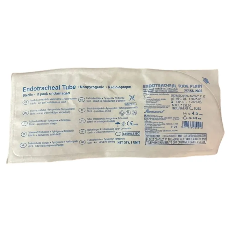 Romsons Endotracheal Tube Plain is also known as a plain ETT medical device used for safe and effective airway management during surgeries and critical care procedures. It is made from thermo-sensitive material, it easily adapts to the body's contours at body temperature, ensuring a comfortable fit and reducing patient discomfort.