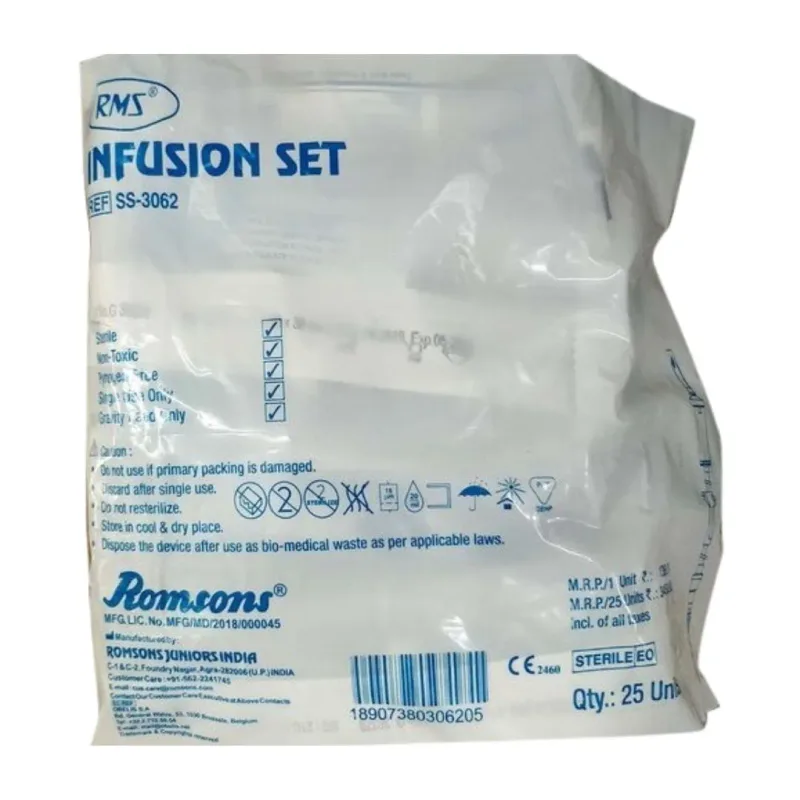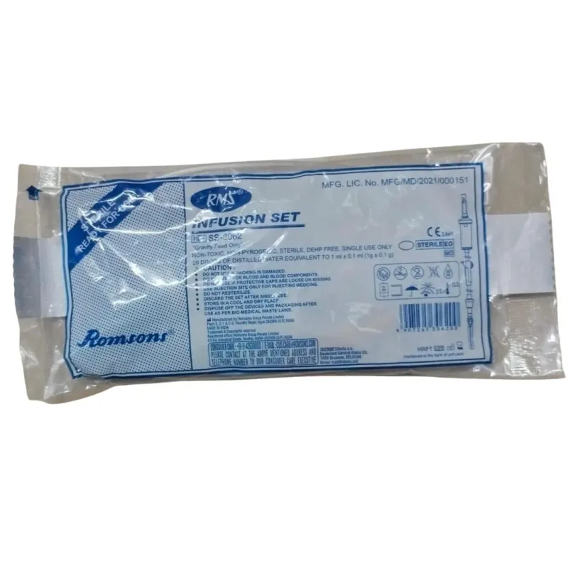 The Romsons R.M.S infusion set is a medical device mainly used with an IV container. It is designed to deliver fluid-like medicine inside the body by inserting it into the vein. It acts the same as an intravenous line.