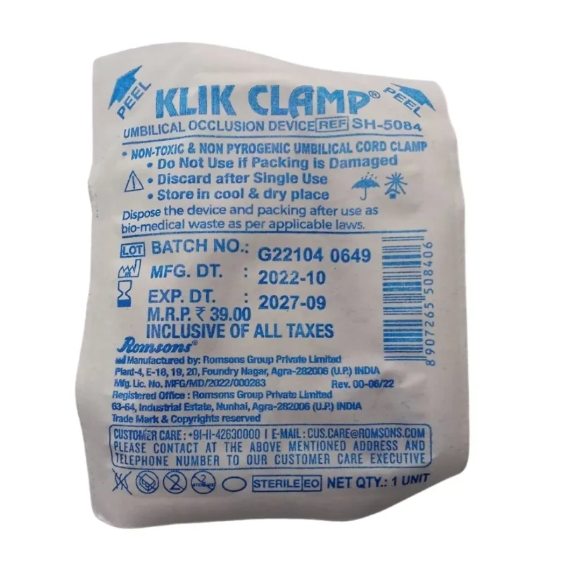Romsons Klik Umbilical Cord Clamp is a medical tool used to cut a newborn baby's umbilical cord immediately after birth. It is provided with a double-purpose security lock click to signify proper locking and prevent accidental reopening.