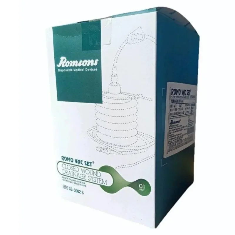 Romsons Romo Vac set (Wound Closure Suction Set) is a medical device used in close wound drainage under negative pressure after surgery, with the possibility of using one or two catheters at the same time.