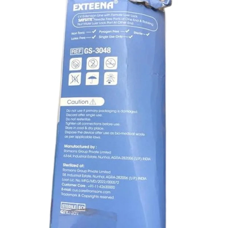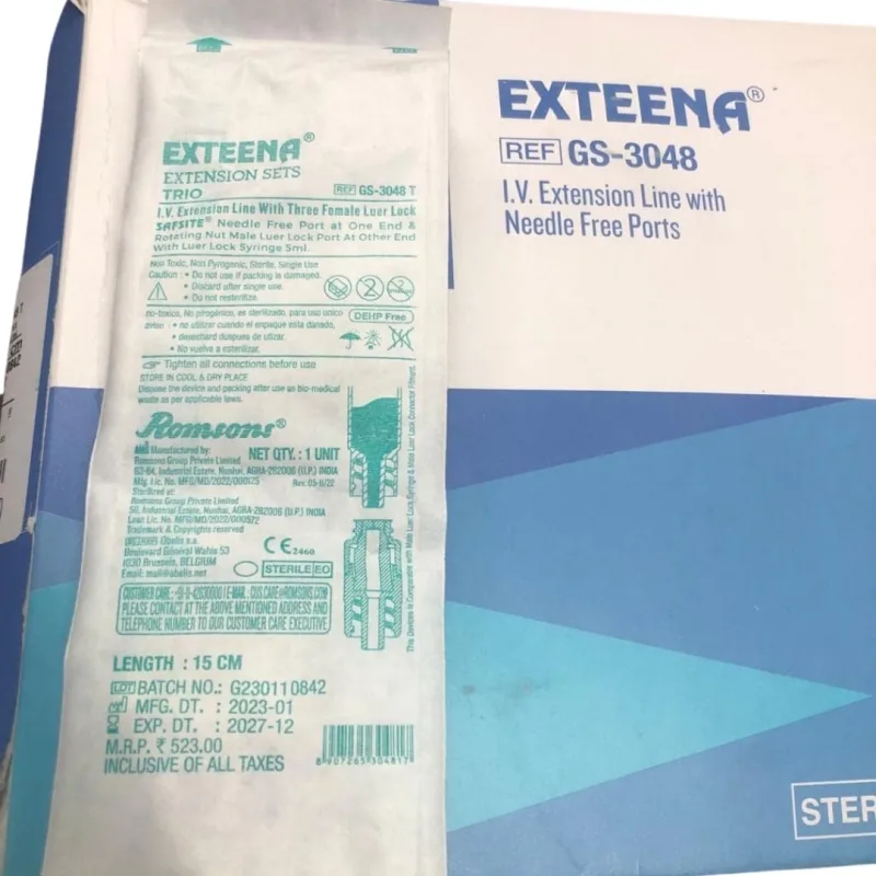 Romsons Exteena-Trio Extension Set is a medical device used to provide a secure, needle-free solution for IV therapy, ensuring safe and efficient fluid administration. It has needle-free devices that help prevent thrombotic occlusion in IV lines while reducing the risk of microbial colonization.