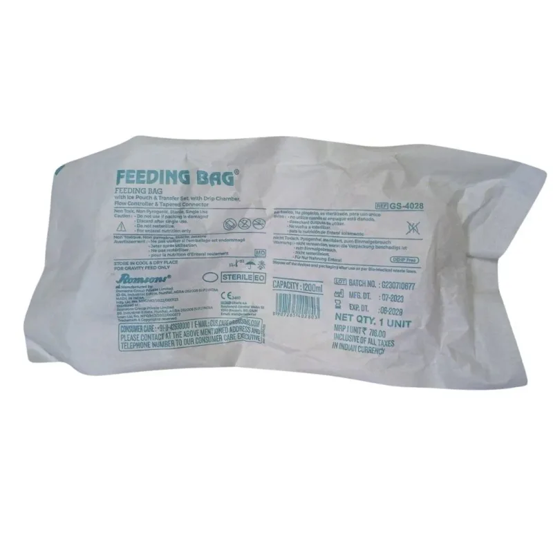 Romsons feeding bag is an enteral feeding bag specially designed to feed patients who are unable to eat by themselves. A Romsons feeding bag delivers the essential liquid nutrition to the stomach directly. It has an ice pouch for preserving the food for a longer period, a transfer set with a drip chamber, a flow controller for accurate flow rate and a tapered connector, making the feeding process easy and comfortable for the patients.