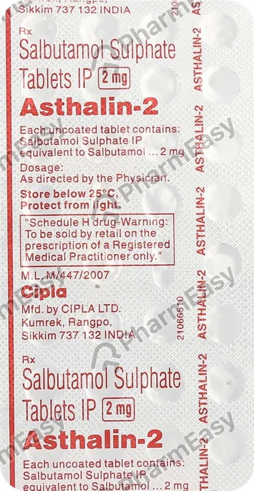 Asthalin Tablet is used to provide relief from symptoms like breathlessness, wheezing sound, chest tightness, coughing, etc. associated with asthma and chronic obstructive pulmonary disease (COPD). It contains Salbutamol as its active ingredient.