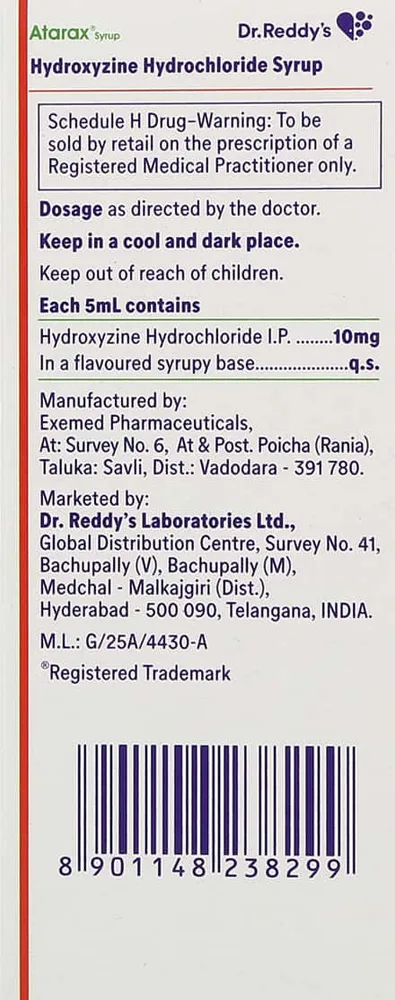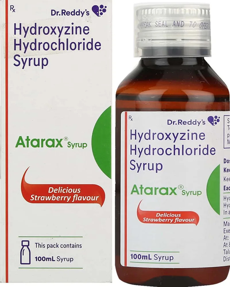 Atarax Strawberry Flavour Syrup is used to manage allergic skin conditions such as itching, hives and an itchy inflammation of the skin. It is an anti-allergic medicine containing Hydroxyzine as an active ingredient. It helps in improving symptoms such as itching, swelling, redness, rashes, scaly and patchy skin.