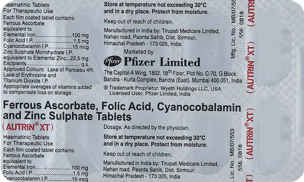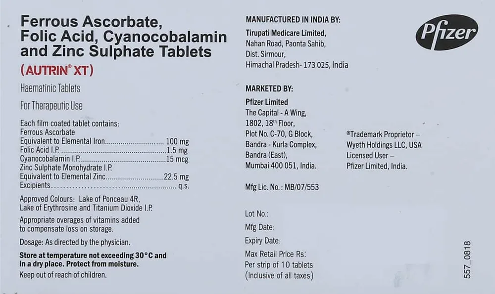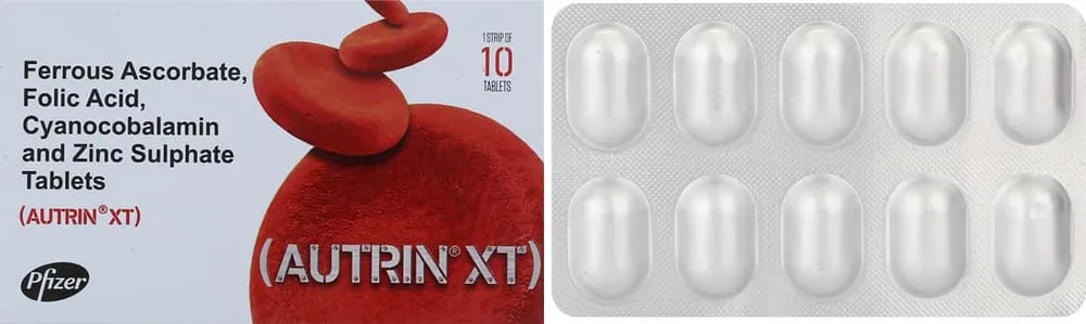 Autrin XT tablet contains vitamin B9 (folic acid), vitamin B12, iron and zinc which is essential for the formation of heamoglobin and red blood cells. This medicine helps to treat iron deficiency.