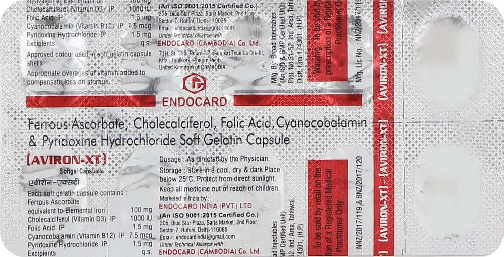 Aviron Xt Capsule is a nutritional supplement that contains a combination of folic acid, ferrous ascorbate, and zinc sulphate monohydrate. These nutrients play an important role in supporting blood health, immune function, and several metabolic processes in the body. Folic acid, also known as vitamin B9, is essential for DNA synthesis and the production of red blood cells.