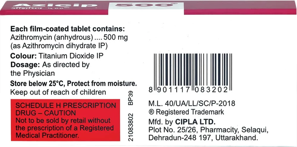 Azicip 500 tablet is an antibiotic medicine used to treat bacterial infections in various parts of the body, including the ears, throat, lungs, skin, soft tissues, and urinary tract. It contains azithromycin as its active ingredient, which works by killing the bacteria responsible for the infection. It is important to take Azicip 500 exactly as prescribed by your doctor.