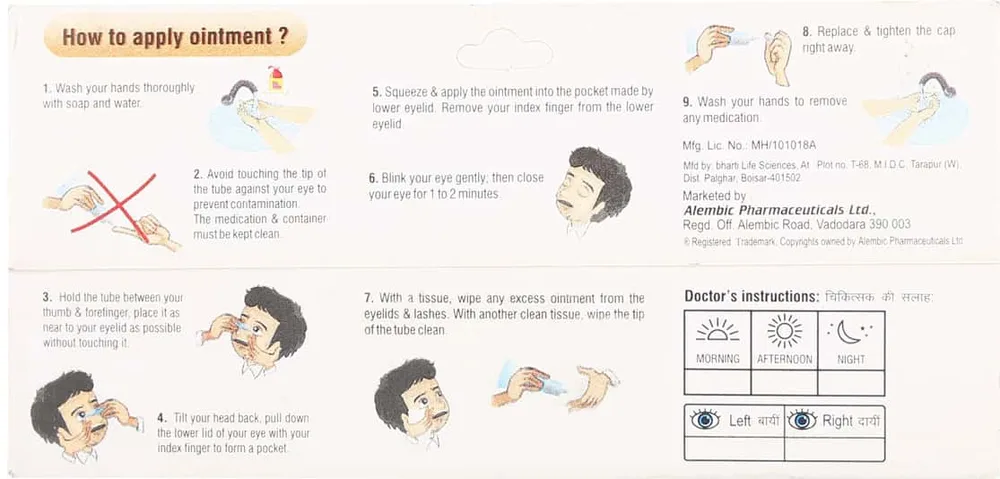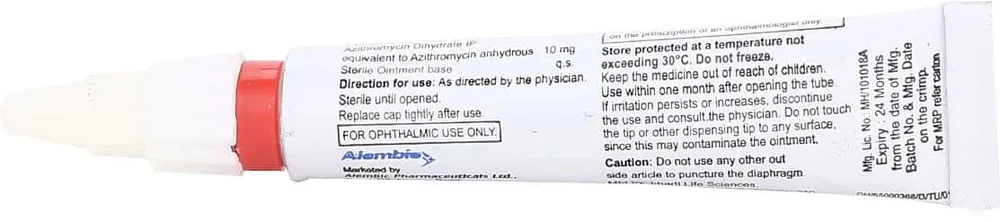 Azithral 1% Eye Oint 5gm eye ointment is meant to be used only for the eyes. Wash your hands before and after ointment application; try not to touch the tip of the tube with your hands as it may contaminate and cause allergy, irritation, swelling or itching of the eyes during application. First, tilt your head in the backward direction while sitting or lying down on the bed. Gently pull down your lower eyelid (affected eye) with your index finger, then squeeze a thin layer of ointment into the eye. Close your eyes gently for 1 or 2 minutes to spread the ointment. Use your dose at regular intervals. Continue the course for the full length of prescribed time even if your symptoms exhaust.