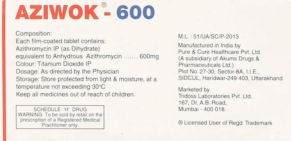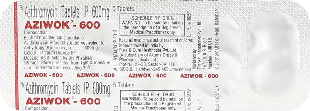 Aziwok Tablet is an antibiotic used to treat bacterial infections in various parts of the body, including the chest, sinuses, ears, lungs, skin, throat, and reproductive organs (such as gonorrhea and chlamydia). It contains azithromycin, a broad-spectrum antibiotic that can kill a wide range of bacteria. To ensure effective treatment, it's important to take Aziwok Tablet exactly as prescribed by your doctor.