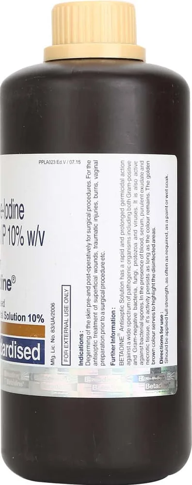 Betadine Skin Solution is a topical antiseptic that is used to treat & prevent infections in minor wounds or cuts. It provides infection protection against a variety of germs that can cause infection in minor cuts, wounds, scrapes and burns. It contains povidone-iodine as its active ingredient.