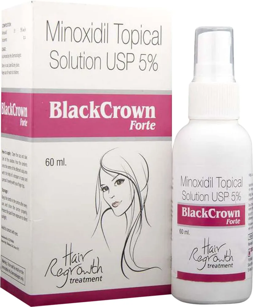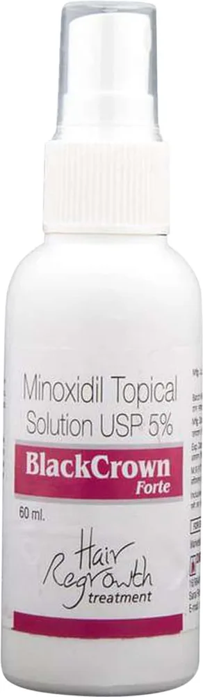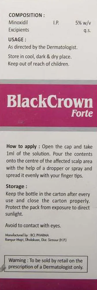 Blackcrown Forte Skin Solution is used in the treatment of hair loss. It contains minoxidil as its active medicine. It dilates the blood vessels and stimulates hair growth on the scalp.
