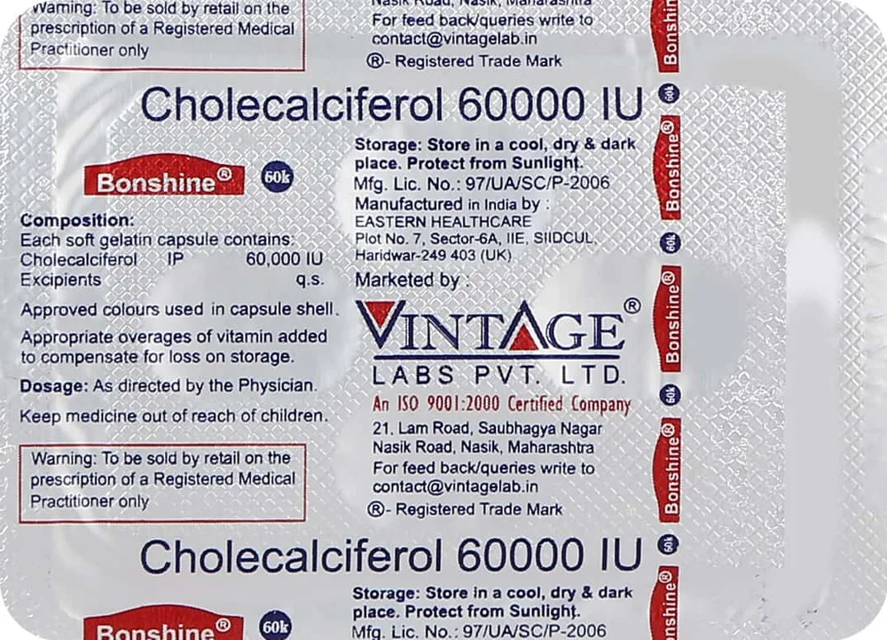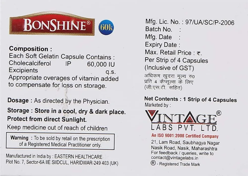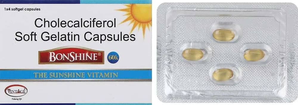 Bonshine Capsule is a vitamin supplement used to treat low blood calcium levels and conditions such as vitamin D deficiency, osteoporosis, hypoparathyroidism, latent tetany, and rickets. It contains cholecalciferol, a form of vitamin D that aids in the absorption of calcium and phosphate. Your physician should determine the dosage.