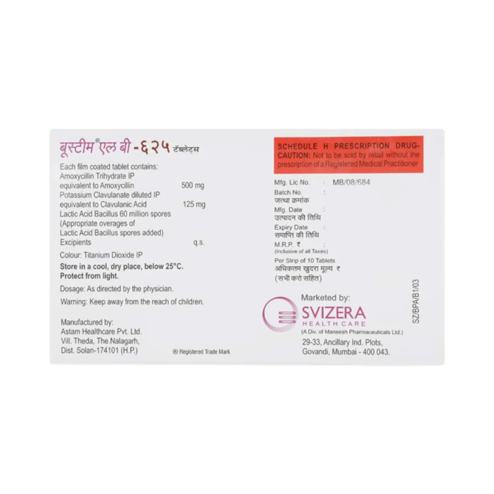 Boostim Lb tablet is used to treat various bacterial infections, including those of the lungs, airways, ears, urinary tract, skin, bones, joints, soft tissue, and teeth. This combination medicine contains amoxicillin and clavulanic acid, both of which belong to the class of antibiotics. Please notify your doctor if you are allergic to antibiotics or have had any allergic reactions after taking them.