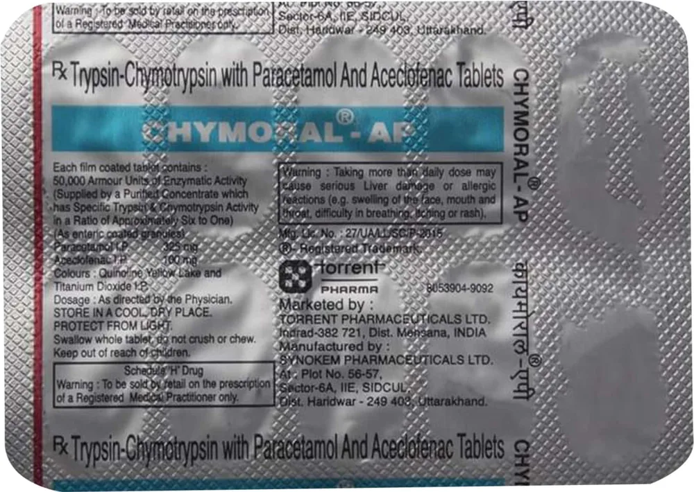 Chymoral-AP tablet is used for relieving swelling and pain in joints and bones. It is a combination medicine containing trypsin-chymotrypsin, paracetamol and aceclofenac. Trypsin and Chymotrypsin are enzymes that improve healing and stimulate tissue repair.
