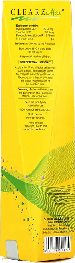 Clearz Max Cream contains a combination of Fluocinolone, Hydroquinone and Tretinoin. It is used in adults to treat melasma of the face (dark and discoloured patches on the skin). Do not use this medicine to treat any other skin conditions than that prescribed by your doctor.