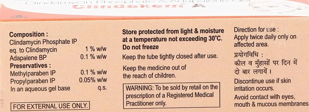 Clindakem A Gel contains two medicines, Clindamycin and Adapalene. Clindakem A Gel is used for the treatment and management of acne. Clindamycin is an antibiotic and Adapalene is a derivative of vitamin A.