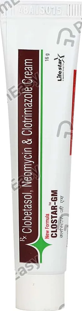 Clostar-GM cream is a combination medicine used for certain types of skin infection such as bacterial infection, fungal infection, etc. This cream contains a combination of three active ingredients namely, clobetasol, clotrimazole and neomycin. Clobetasol is a steroid and has anti-inflammatory properties.