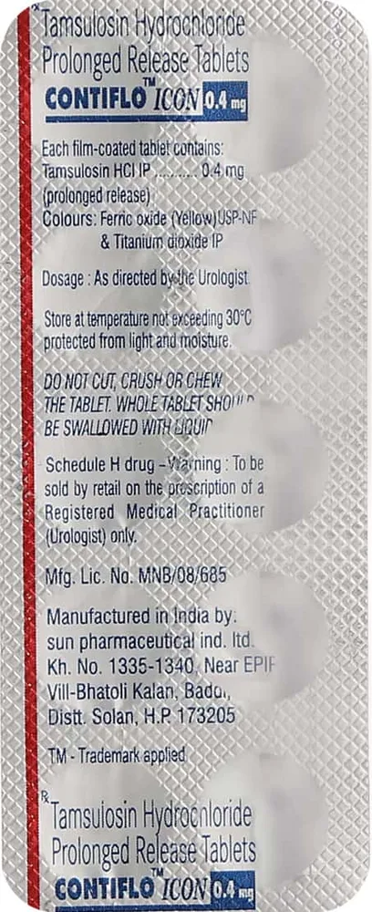 Contiflo Icon Tablet is used for the treatment of symptoms of an enlarged prostate in males, it is also called benign prostate hyperplasia (BPH). It helps in relieving the symptoms such as frequent urination, pain while urinating, difficulty in passing urine, etc in BPH. It contains tamsulosin as its active ingredient which belongs to the class of medicines called an alpha-adrenergic blocker.