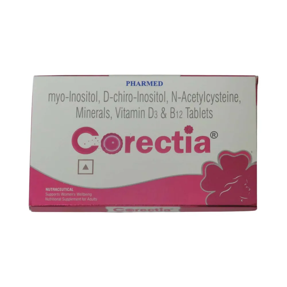 Corectia Tablet is a combination of Myo-inositol and D-chiro-inositol, along with essential vitamins and minerals, for the adjunctive management of Polycystic Ovarian Syndrome (PCOS). Corectia Tablet helps regulate the menstrual cycle, maintain ovarian function & health, and lower androgen levels, supporting hormonal balance.