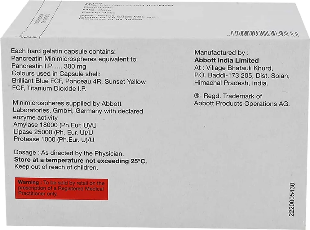 This medicine helps in the digestion of sugars, fats and proteins in individuals who have defective/non-functional pancreas. It is advised to drink plenty of water when consuming this medicine. It is advised that you consult your doctor about your medical conditions before the use of this Capsule.