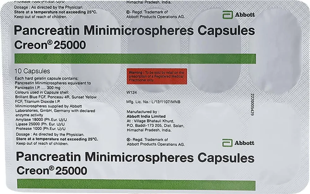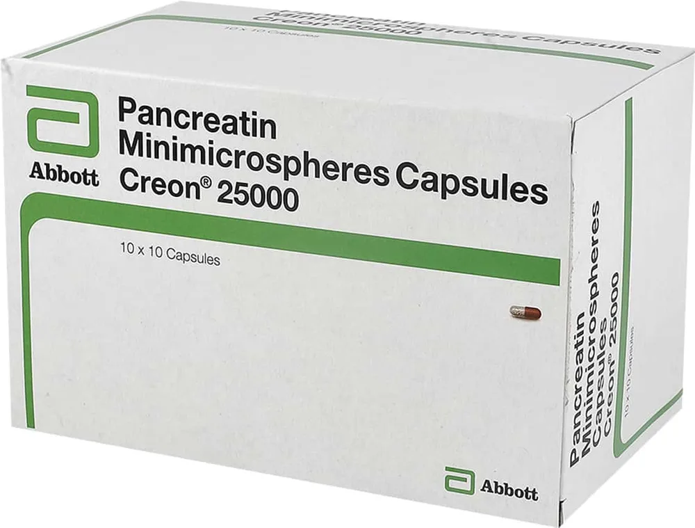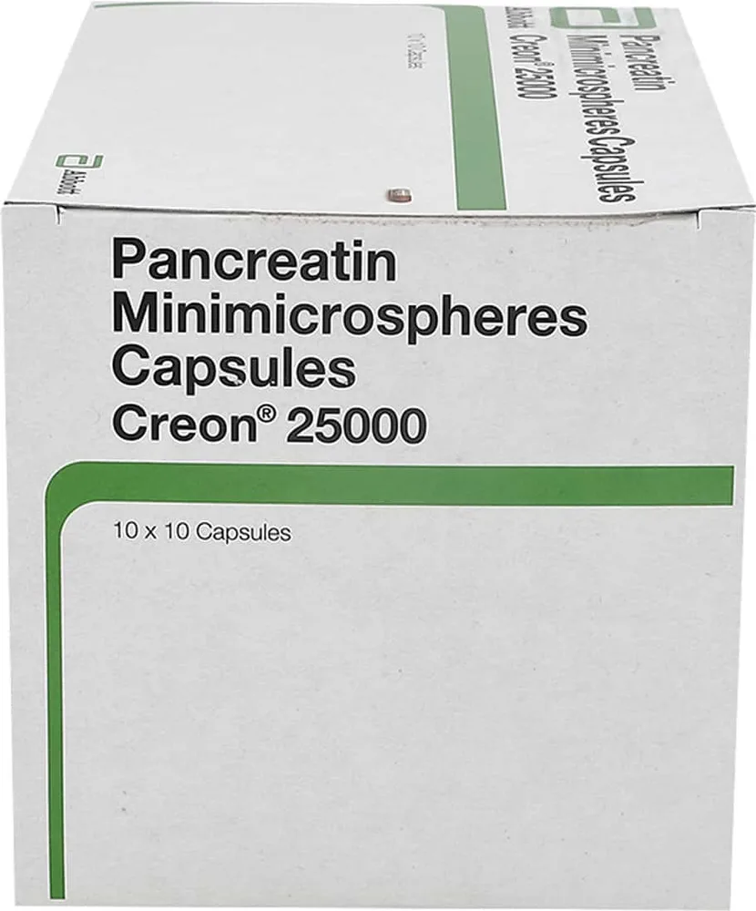 Creon Capsule is a replacement therapy for enzymes that are naturally produced by the pancreas. Certain diseased conditions like excessive mucous production that blockages the pancreatic duct (cystic fibrosis), long term inflammation of the pancreas (chronic pancreatitis) and/or surgical removal of the pancreas lead to a deficiency of the necessary pancreatic enzymes. Creon Capsules contain the enzymes derived from animal source (pork).