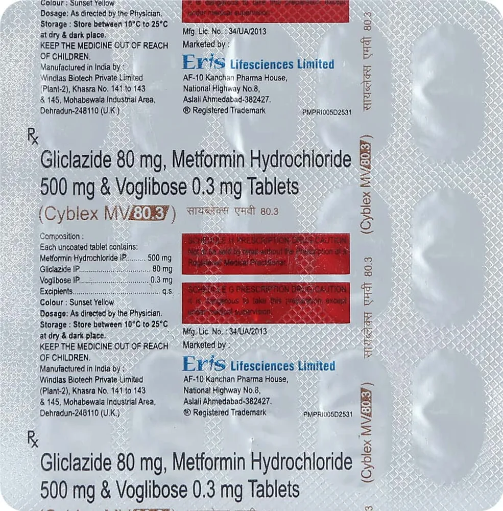 Cyblex Mv Tablet is a combination medicine used in the treatment of type 2 diabetes mellitus. It contains metformin, gliclazide, and voglibose as its active components. This medicine should be taken as directed by the doctor and in doses and duration as prescribed.