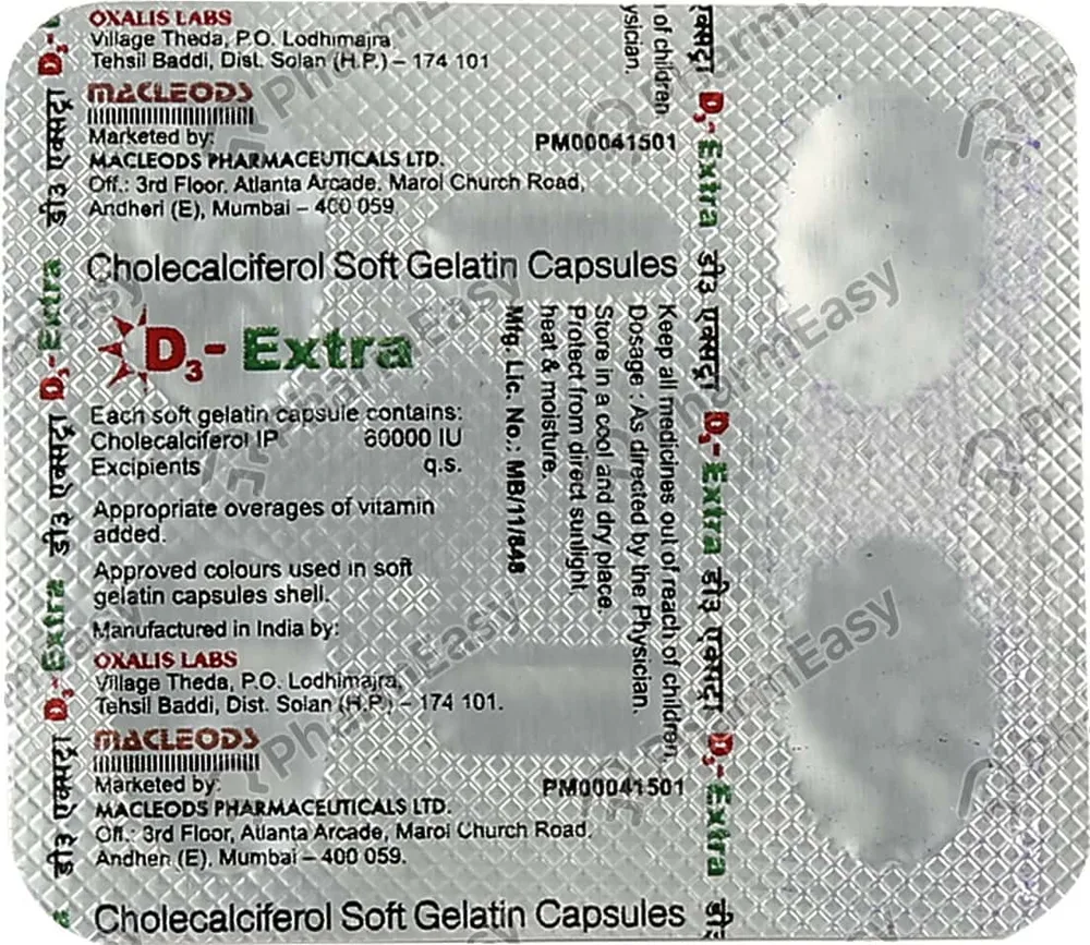 D3 Extra Softgel Capsule is a vitamin supplement used to treat low blood calcium levels and conditions such as vitamin D deficiency, osteoporosis, hypoparathyroidism, latent tetany, and rickets. It contains cholecalciferol, a form of vitamin D that aids in the absorption of calcium and phosphate. Your physician should determine the dosage.