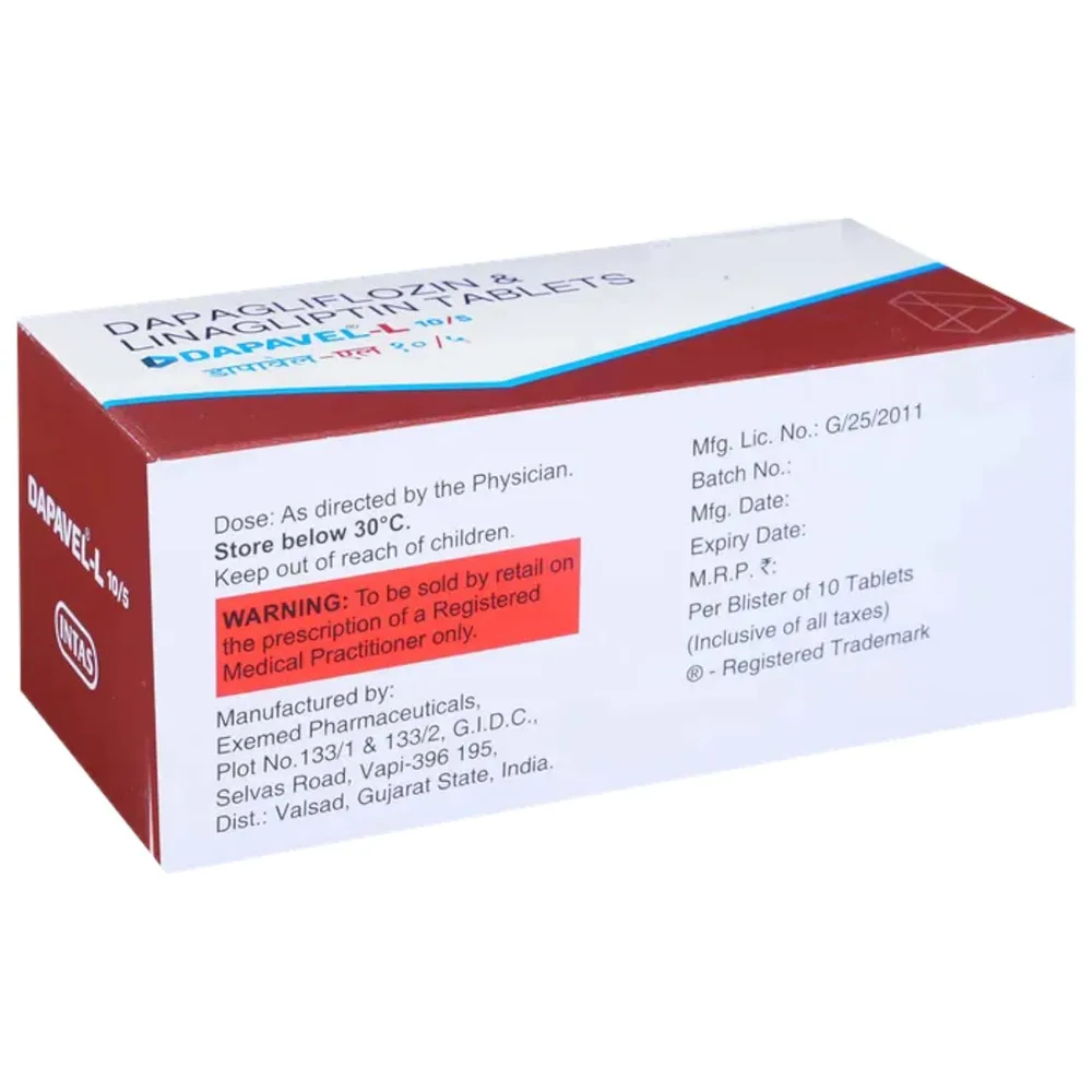 Dapavel L Tablet is used to treat type 2 diabetes mellitus in conjunction with diet and exercise to enhance blood glucose levels. It contains a combination of linagliptin and dapagliflozin as active ingredients. It lowers high blood sugar levels by excreting excess sugar through urine, increasing insulin secretion, and reducing glucose release into the bloodstream.