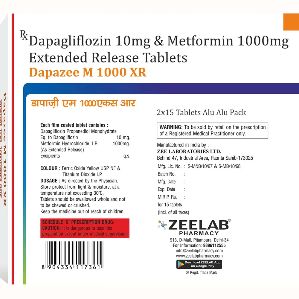 Dapazee M Xr tablet is an anti-diabetic medication prescribed to help manage Type 2 diabetes mellitus in adults, alongside a healthy diet and regular exercise. The active ingredients in Dapazee M Xr tablet are dapagliflozin and metformin. This medication is intended for adults aged 18 years and older.