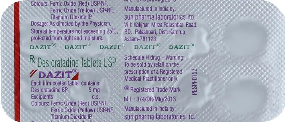 Dazit 5mg tablet is an anti-allergic medicine that contains desloratadine as its active ingredient. This medicine helps you by providing relief from the symptoms of allergy (food allergy, dust allergy, etc) like a running nose, sneezing, red and itchy eyes, hives and rashes on the skin. This medicine does not make you sleepy, hence considered comfortable to take.