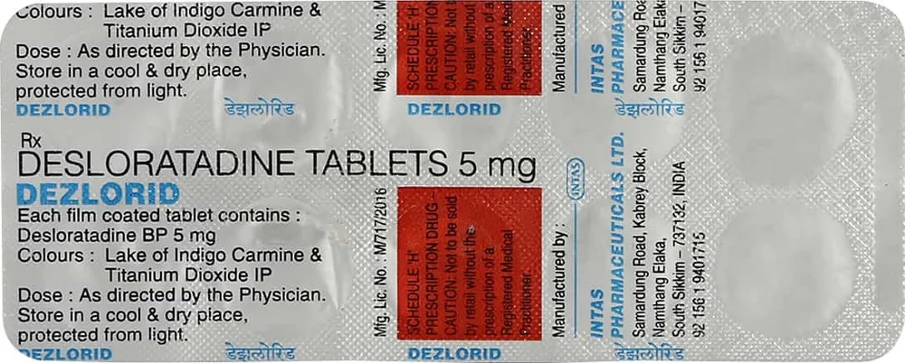 Dezlorid Tablet is an anti-allergic medicine containing desloratadine as its active ingredient. It helps you by providing relief from the symptoms of allergy (food allergy, dust allergy, etc.) like a running nose, sneezing, red and itchy eyes, hives and rashes on the skin.
