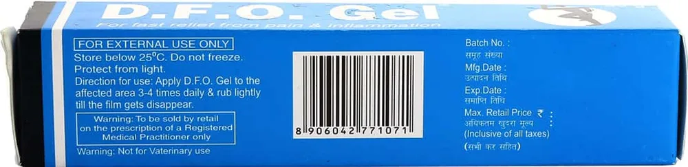 DFO gel is a topical pain relief gel. It is a combination of diclofenac, methyl salicylate, menthol, and linseed oil. It is used to treat pain, swelling, and inflammation due to muscle and joint-related problems.