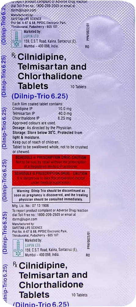 Dilnip Trio Tablet is used for the treatment of high blood pressure, when blood pressure cannot be controlled by telmisartan, cilnidipine or chlorthalidone alone.