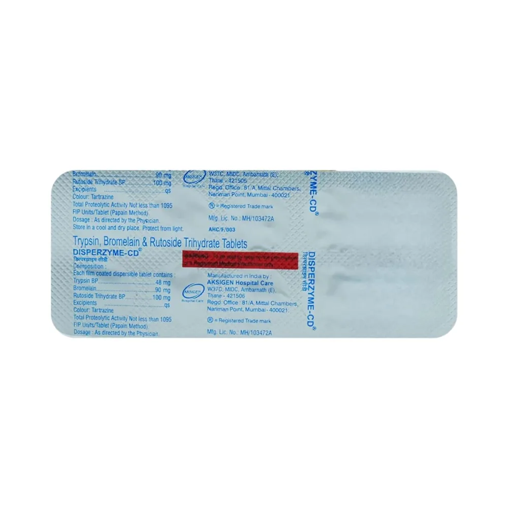 Disperzyme Cd Tablet contains a combination of Trypsin, Bromelain, and Rutoside. Trypsin and Bromelain are proteolytic enzymes, whereas rutoside is an antioxidant.
