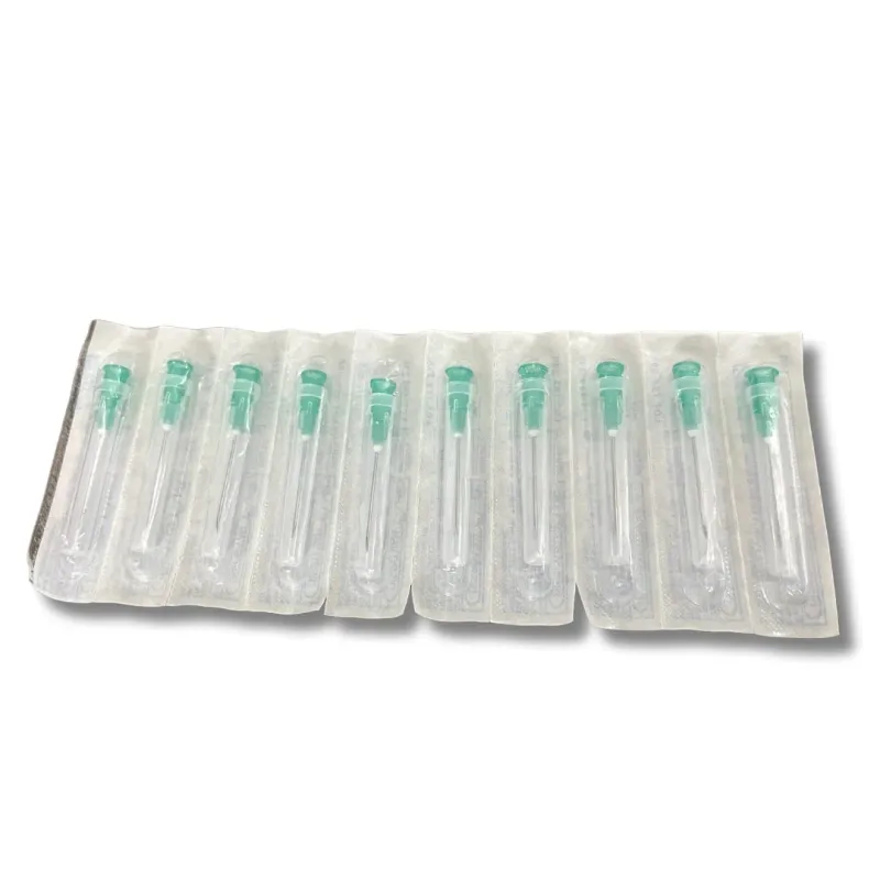 Each needle is individually packaged to maintain sterility until the point of use. The green color coding indicates the 21-gauge size, which is a common specification for various medical applications. The 1.