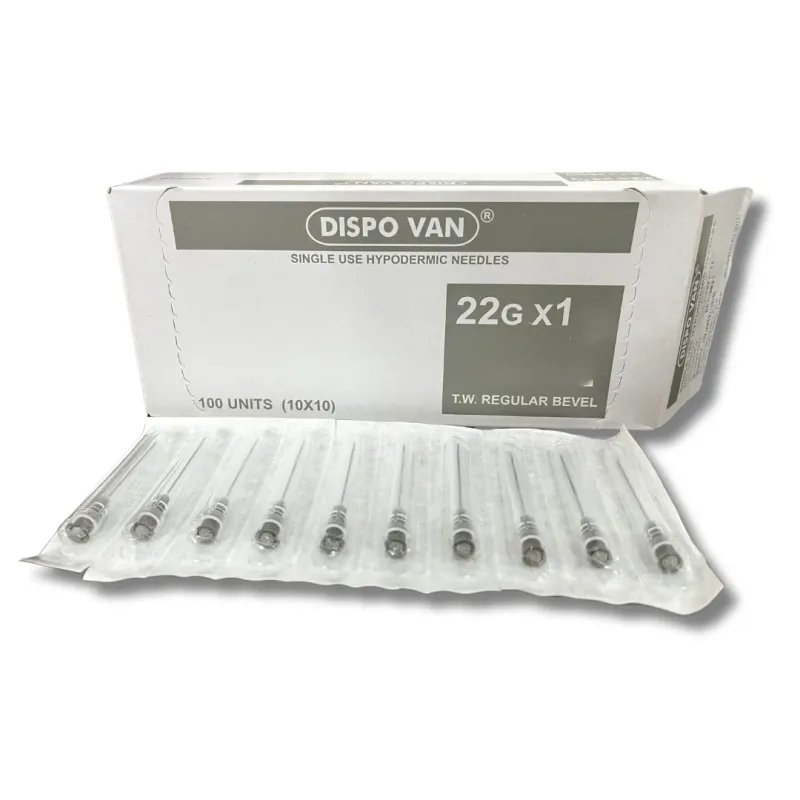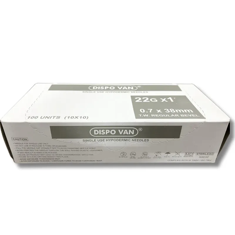 The material used is medical-grade stainless steel. The bevel type is regular. The gauge is 22G and the length is 1 inch.