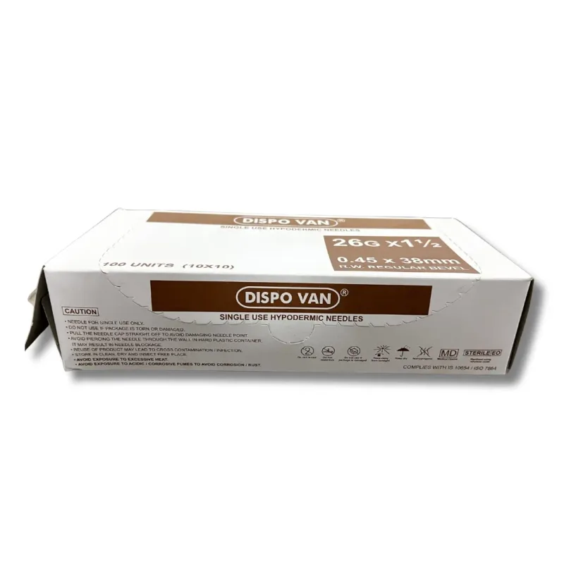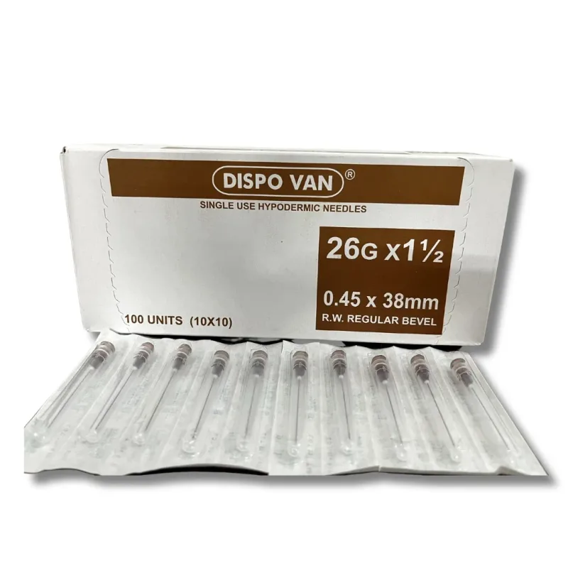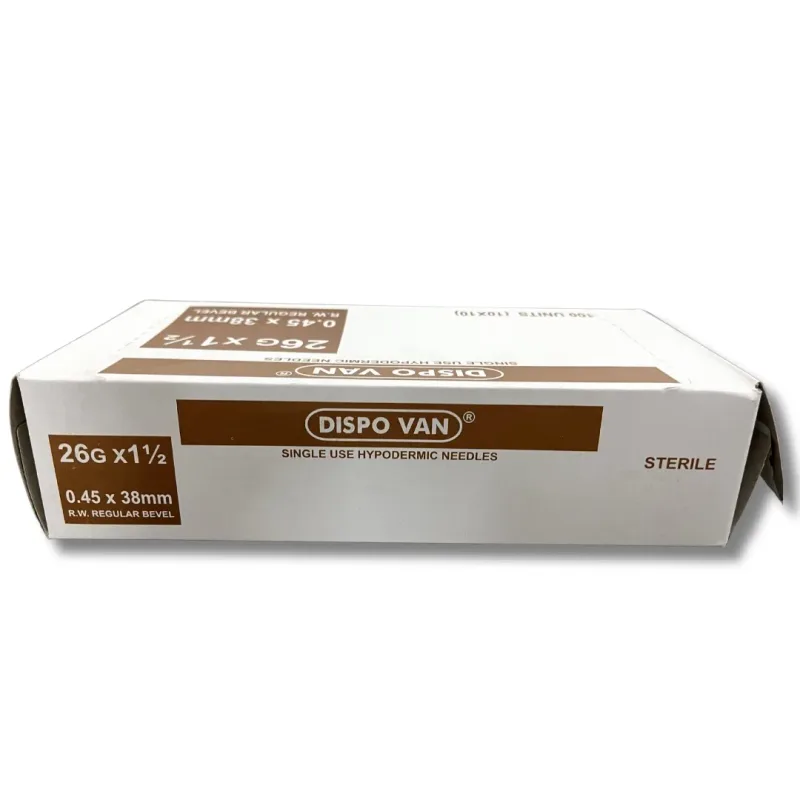 This product is a sterile, single-use hypodermic needle designed for the administration of liquid medications and other fluids into the body. It is constructed from medical-grade stainless steel, featuring a regular bevel for smooth penetration. The needle's dimensions are 26 gauge (G) in diameter and 1.