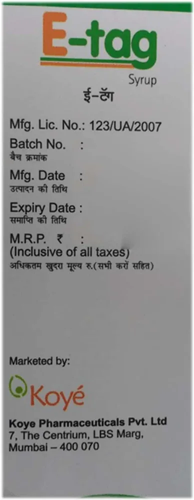 E Tag Syrup is used to treat cough associated with mucus. It works by loosening and thinning the mucus in the nose, throat, and lungs, making it easier to expel through coughing. It also helps relax and widen the airway muscles, allowing easier breathing.