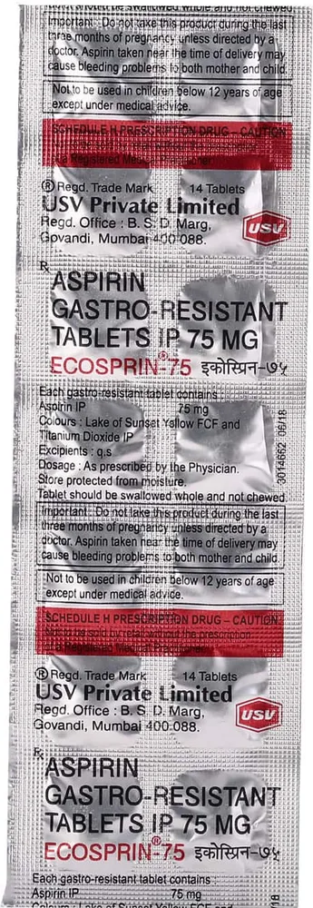 Ecosprin 75 tablet is a medication that helps prevent heart attacks, strokes, and angina. It is also used in patients who have had angioplasty. The active ingredient is low-dose aspirin.